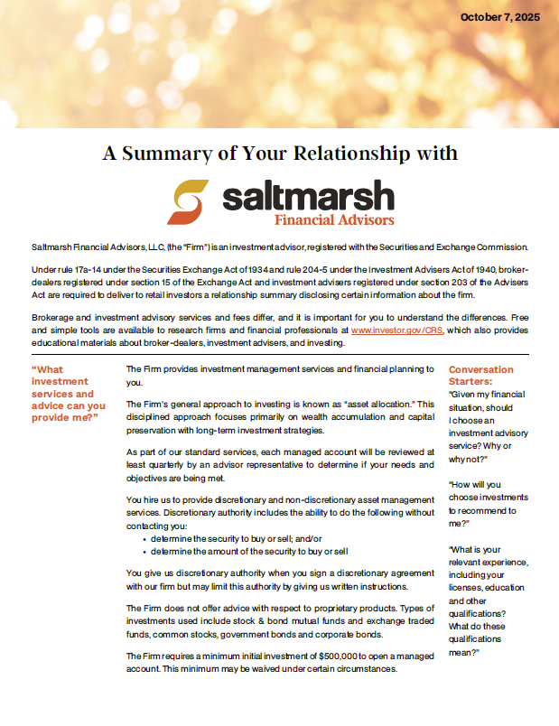 Saltmarsh Financial Advisors, LLC operates in connection with the brand Saltmarsh. Saltmarsh is the brand name under which Saltmarsh CPAs, Inc. and Saltmarsh, Cleaveland & Gund provide professional services. Saltmarsh CPAs, Inc. and Saltmarsh, Cleaveland & Gund practice as an alternative practice structure in accordance with the AICPA Code of Professional Conduct and applicable law, regulations and professional standards. Saltmarsh CPAs, Inc. is a licensed independent CPA firm that provides attest services to its clients. Saltmarsh, Cleaveland & Gund and its subsidiary entities, which are not licensed CPA firms, provide tax, advisory, and other non-attest services to its clients. The entities falling under the Saltmarsh brand are independently owned and are not liable for the services provided by any other entity providing the services under the Saltmarsh brand. Our use of the terms "our firm" and "we" and "us" and terms of similar import, denote the alternative practice structure conducted by Saltmarsh CPAs, Inc. and Saltmarsh, Cleaveland & Gund.